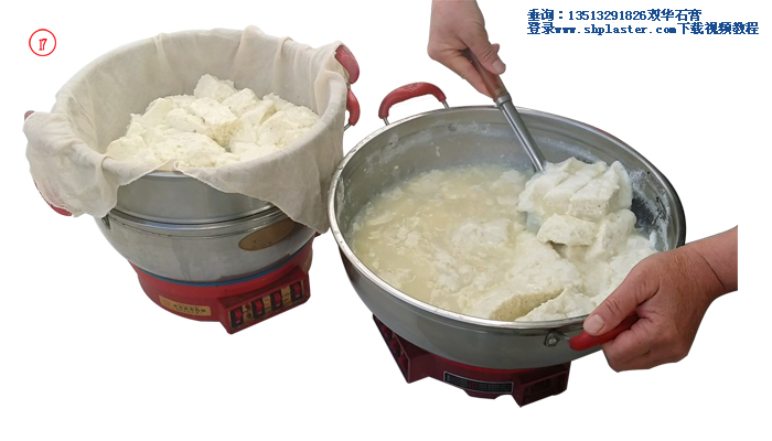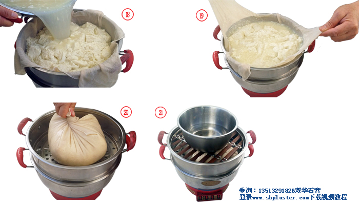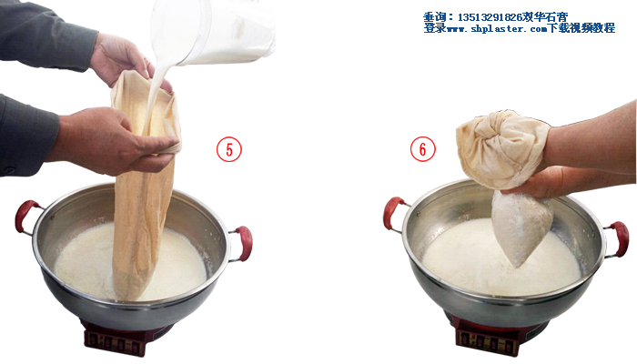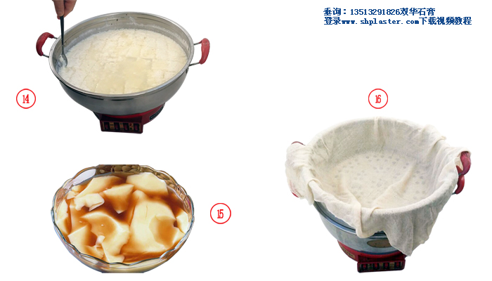 步驟12: 激烈攪拌煮開的豆?jié){,與此同時把石膏漿倒入豆?jié){中,此時豆?jié){的溫度大約在96℃左右。(溫馨提示:豆?jié){溫度越高,所用的食品級點石膏粉的數量越少,反之則食品級點石膏粉用量越多。如果豆?jié){溫度降到85℃時,食品級點豆腐石膏粉的用量要增加到每100克干黃豆,4克食品級點豆腐石膏粉。)